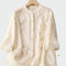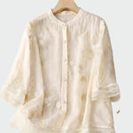 Top u boji ecru s diskretnim cvjetnim vezom je elegantan i prozračan komad koji isijava ženstvenost i jednostavnost. S gumbima sprijeda i 3/4 rukavima, nudi udobnost i stil za svaku priliku.