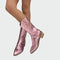 Ženske **kaubojke u metalik ružičastoj** boji koje privlače poglede svojim jedinstvenim karakterom. Imaju **bogat vezeni uzorak** i bočni patentni zatvarač za jednostavno oblačenje, dok niska drvena peta pruža udobnost i stil pri svakom vašem koraku. Idealne su za hrabre street-style kombinacije i modne nastupe koji se ističu.