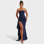 Elegantna maksi haljina bez naramenica dizajnirana je da naglasi figuru i produži siluetu. Naborani korzet lijepo oblikuje područje prsiju i struka, dok visoki bočni prorez s asimetričnim padajućim panelom daje efekt crvenog tepiha i otkriva upravo onoliko koliko treba. Rastezljiva, glatka tkanina prati pokret i pruža udobnost od prve zdravice do zadnjeg plesa. Savršena za vjenčanja, gala događaje i sve večeri kada želiš izgledati besprijekorno.