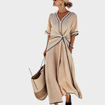 Ova duga, lepršava haljina savršena je kombinacija udobnosti i ženstvene elegancije. S modernim V-izrezom, decentnim crnim obrubom i stiliziranim čvorom u struku, ističe figuru i dodaje sofisticiran detalj. Idealna je za ljetne šetnje, odmor uz more ili opuštene večernje izlaske.