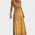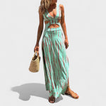 Sa strateškim rezovima i opuštenim uzorkom, ova duga haljina je savršeni izraz slobode i stila. Idealna za sunčane dane, festivale, izlete uz more ili večernje susrete, lako se prilagođava najopuštenijim trenucima bez gubitka sofisticiranog dodira.