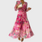 Ova elegantna maxi haljina donosi dašak romantike i ženstvenosti. S dugim rukavima, V-izrezom i pojasom koji naglašava struk, savršeno ističe figuru dok lepršavi slojevi stvaraju lagan i graciozan pokret. Cvjetni uzorak daje joj svježinu i sofisticiranost, čineći je idealnim izborom za svečane prilike, večernje izlaske ili ljetne romantične trenutke.
