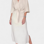 Jednostavnost koja očarava s siluetom osmišljenom da prirodno istakne. Haljina Natalija kombinira duboki V-izrez s kimono rukavima i središnjim čvorom koji nježno naglašava struk. Njezina strukturirana tkanina i funkcionalan dizajn čine je svestranom i elegantnom osnovnom haljinom.