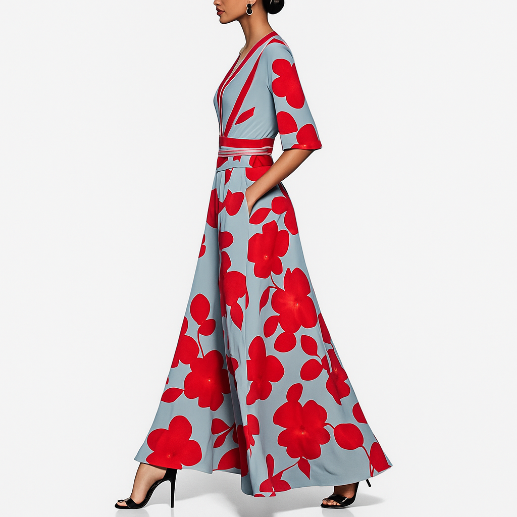 Upečatljiva maksi haljina s dubokim preklopnim V-izrezom i kimono rukavima stvara profinjenu, izduženu siluetu. Naglašeni pojas definira struk, dok raskošna, lepršava suknja s prednjim prorezom daje dramatičan pokret pri svakom koraku. Praktični bočni džepovi diskretno su skriveni u šavu za dozu svakodnevne funkcionalnosti. Idealna za vjenčanja, koktele i sve posebne prilike kada želiš izgledati jedinstveno.