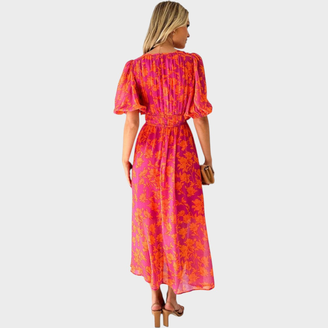 Ranka - Cvjetna midi haljina s puf rukavima i V-izrezom