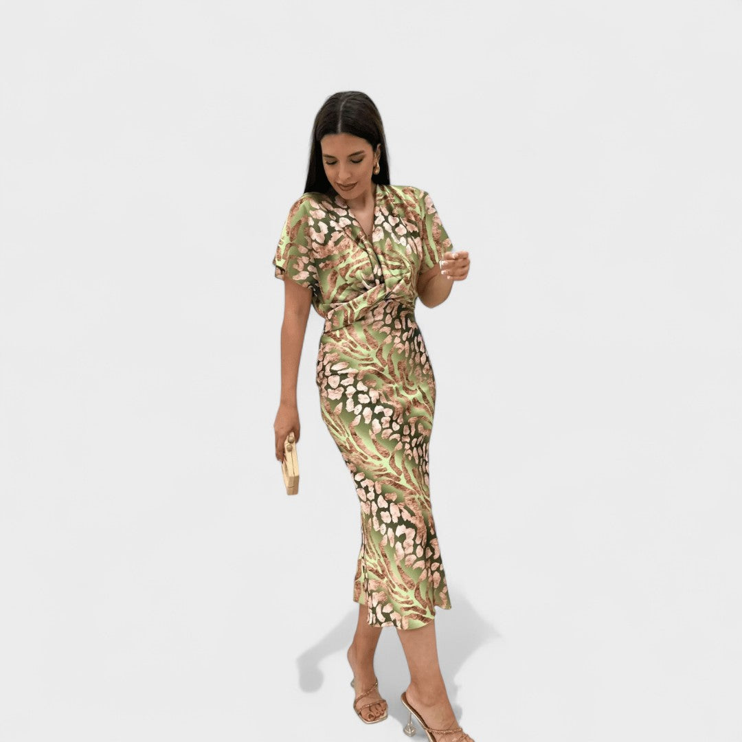 Sofisticirana midi haljina s lepršavim rukavima i drapiranim V-izrezom koji nježno naglašava dekolte. Tkanina s profinjenim sjajem i dekorativnim uzorkom elegantno pada preko tijela, dok definirani struk oblikuje ženstvenu siluetu. Završetak koji se blago širi omogućuje graciozan hod — idealno za vjenčanja, koktele i sve posebne prilike.