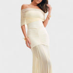 Ova duga haljina od pletenine je oda elegantnoj senzualnosti. S otkrivenim ramenima i uskim krojem, savršeno se prilagođava tijelu, dok prozirna suknja dodaje fluidnost i sofisticiranost svakom pokretu. To je idealan izbor za isticanje na posebnim događanjima s modernim i odvažnim izgledom.
