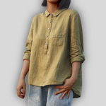 Klasična lanena bluzica koja zrači diskretnom elegancijom i svakodnevnom udobnošću. Ima klasičan ovratnik s gumbima sprijeda i praktičnu džep na prsima. Opušteni kroj i dugi rukavi s mogućnošću podizanja čine je idealnom za sve sate u danu.