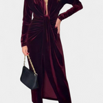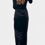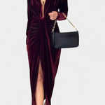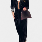 Očaravajuća silueta koja kombinira senzualnost i bezvremensku eleganciju. Vilma se ističe dubokim V-izrezom koji izdužuje figuru, dugim rukavima koji uravnotežuju dizajn i prednjim prorezom koji dodaje dinamiku i odvažan dodir. Zlatni završetak pojačava njezin magnetski karakter, čineći je komadom osmišljenim da zasja u svakoj prilici.