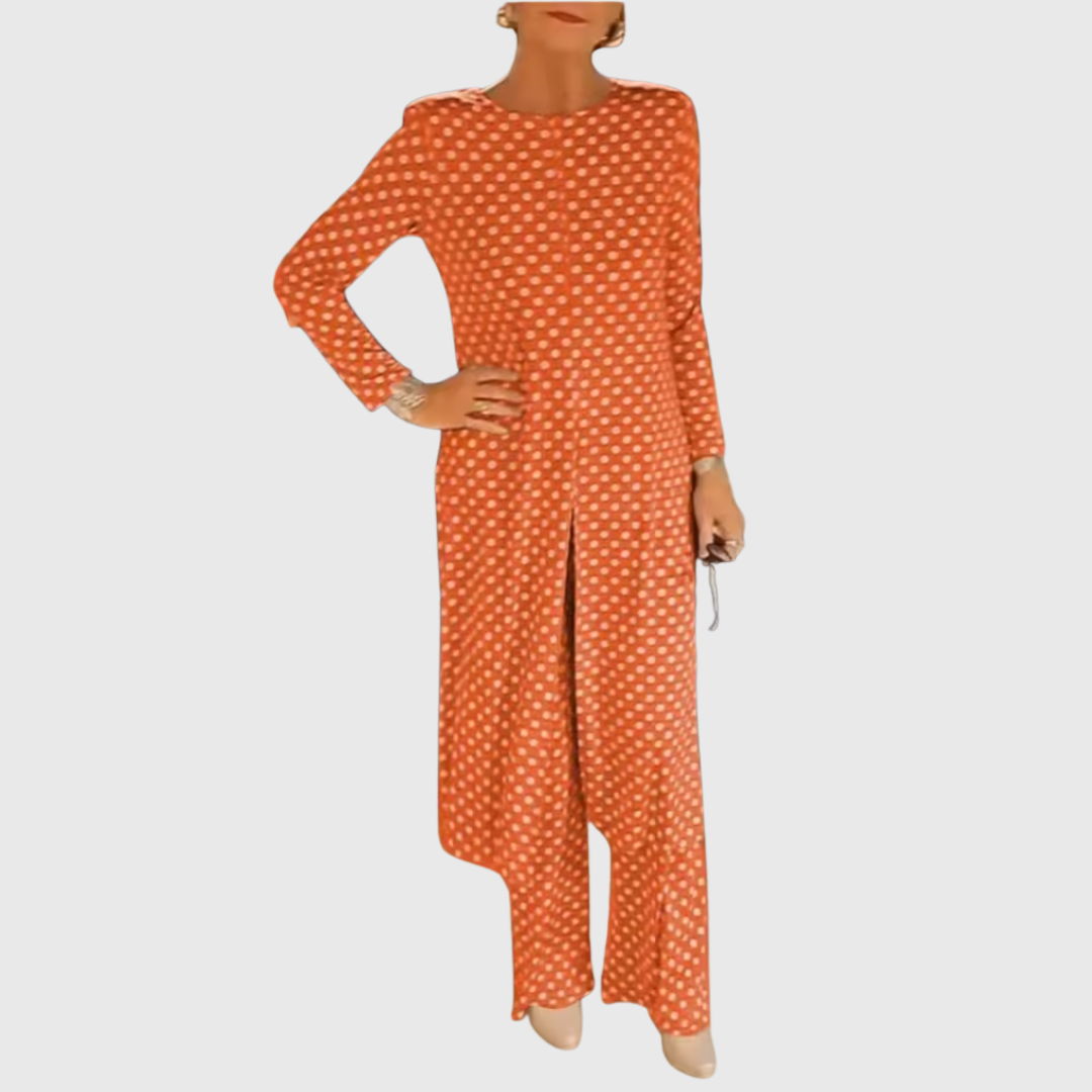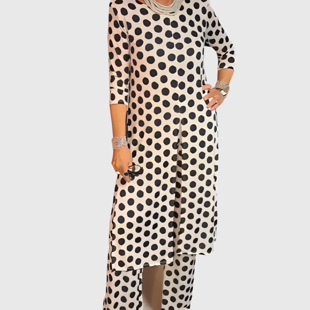 Ovaj elegantni crno-bijeli kombinezon na točkice spaja retro šarm i modernu udobnost. Dugi rukavi i lepršavi kroj čine ga savršenim izborom za dnevne i večernje prilike. Bilo da ga nosite s cipelama na petu za sofisticirani izgled ili s balerinkama za ležernu varijantu, ovaj model osigurava stil i udobnost u isto vrijeme.