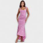Ova prekrasna duga haljina u mekoj ljubičastoj boji kombinira eleganciju i ženstvenost, s romantičnim detaljima i krojem koji obavija tijelo. Korset s drapiranim dizajnom ističe struk, dok asimetrična suknja dodaje pokret i gracioznost svakom vašem koraku.