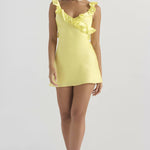 Razigrana i ženstvena mini haljina koja kombinira eleganciju i svježinu. Asimetrični detalj s volanima na dekolteu daje posebnu dinamiku i stil, dok uski kroj na najprivlačniji način ističe siluetu. Idealna za ljetne večeri i elegantne izlaske.