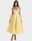 Zapanjujuća midi haljina u svijetloj žutoj boji koja isijava eleganciju i ženstvenost. Korsetski dizajn gornjeg dijela naglašava dekolte s finim detaljem, dok bogata A-linija suknje pruža pokret i romantično raspoloženje. Idealna za ljetne izlaske, večernje događaje i posebne prigode.