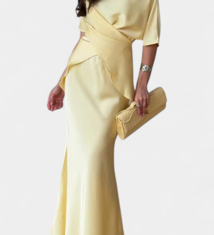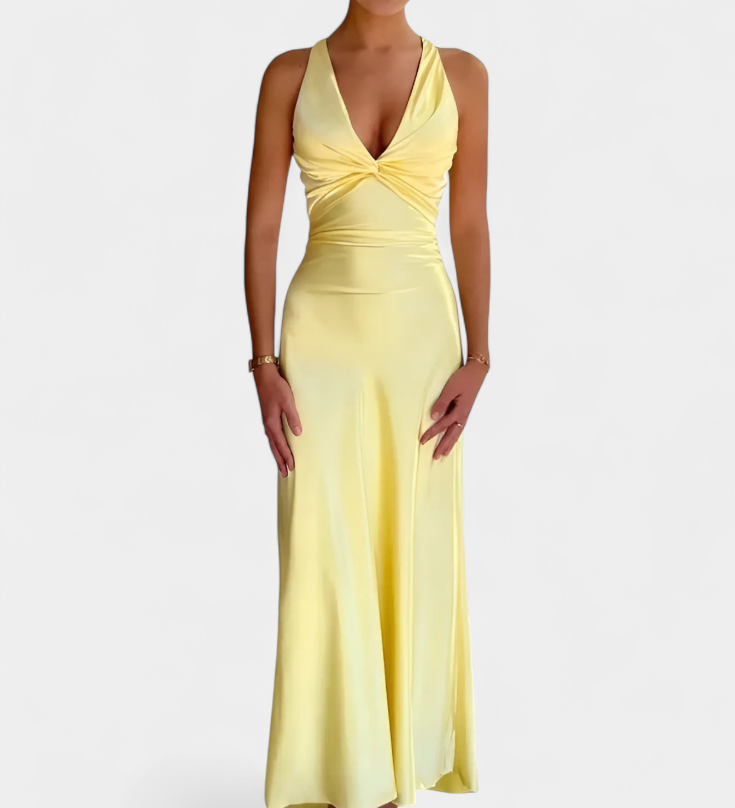 Milica Duga Haljina od Milk Svile s Dubokim Izrezom i Oblikovanim Nabranjem