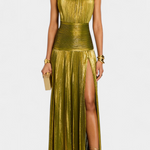 Skulpturalni glamur s magnetskom energijom. Haljina Hana oduševljava svojim metalik završetkom u nijansi peridot i siluetom koja teče s moći i elegancijom. Njen definirani halter izrez, otvorena leđa i naglašeni razrez stvaraju savršenu ravnotežu između strukture i pokreta.