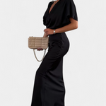 Haljina Nada u jednobojnoj nijansi nudi idealnu ravnotežu između opuštenog stila i elegantnog dizajna. S omotanim V izrezom, prednjim križnim čvorom i kratkim rukavima, ova uska silueta fluidno ističe figuru. Idealna je za neformalne planove kao i za posebne prigode.