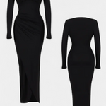 Elegantna i bezvremenska, haljina Jelena dizajnirana je kako bi istaknula figuru s savršenim balansiranjem između sofisticiranosti i svestranosti. Njezin duboki V izrez stvara ženstvenu i vitku siluetu, dok delikatno plisiranje dodaje suptilan pokret i rafinirani izgled. Dugi rukavi čine je idealnom odjećom za svježe sezone ili formalne prilike gdje želite istaknuti s elegancijom.