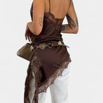- Asimetrični rub s intrikatnom čipkom koja dodaje romantičnost