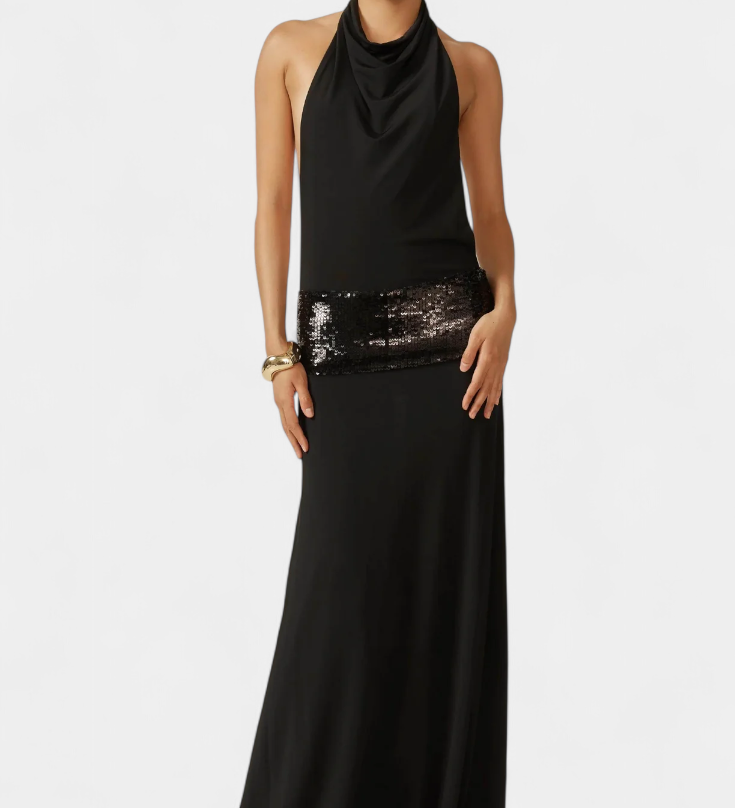Hana Halter Metalik Haljina s Otvorenim Leđima i Visokim Razrezom